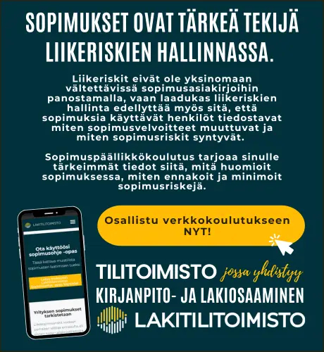 Suomen Lakitilitoimiston blogi kokoaa yhteen taloushallinnon, verotuksen ja juridiikan ajankohtaisimmat aiheet, selkeästi ja yrittäjää hyödyttävällä tavalla. Kirjoituksemme auttavat sinua johtamaan yrityksesi taloutta viisaasti, ennakoimaan muutoksia ja tekemään päätöksiä, jotka kestävät myös lain ja verotuksen näkökulmasta.